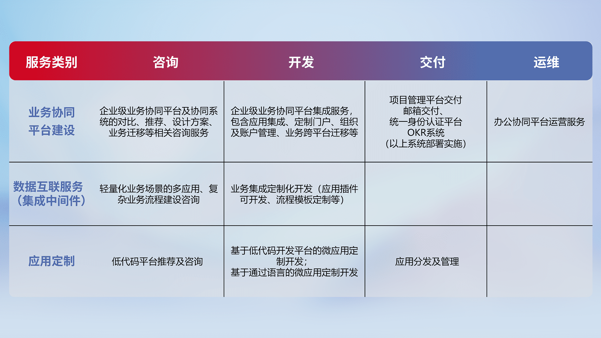 针对钉钉、、企微、、IDaas等平台级产品提供产品的规划、、、、方案、、、、交付、、、定制化开发等服务,,,,实现如统一协同办公、、、、智能客户服务、、、、混合会议管理、、、智能数据查询、、、、等业务场景,,,,实现数字化转型。。。